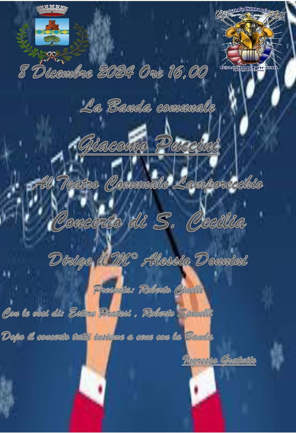 In occasione delle festività natalizie, come di consueto, l'amministrazione comunale è lieta di invitarvi allo spettacolo musicale "Concerto di S. Cecilia" organizzato da La Banda Giacomo Puccini per il giorno 8 dicembre 2024 alle ore 16.00 presso il Teatro comunale di Lamporecchio
