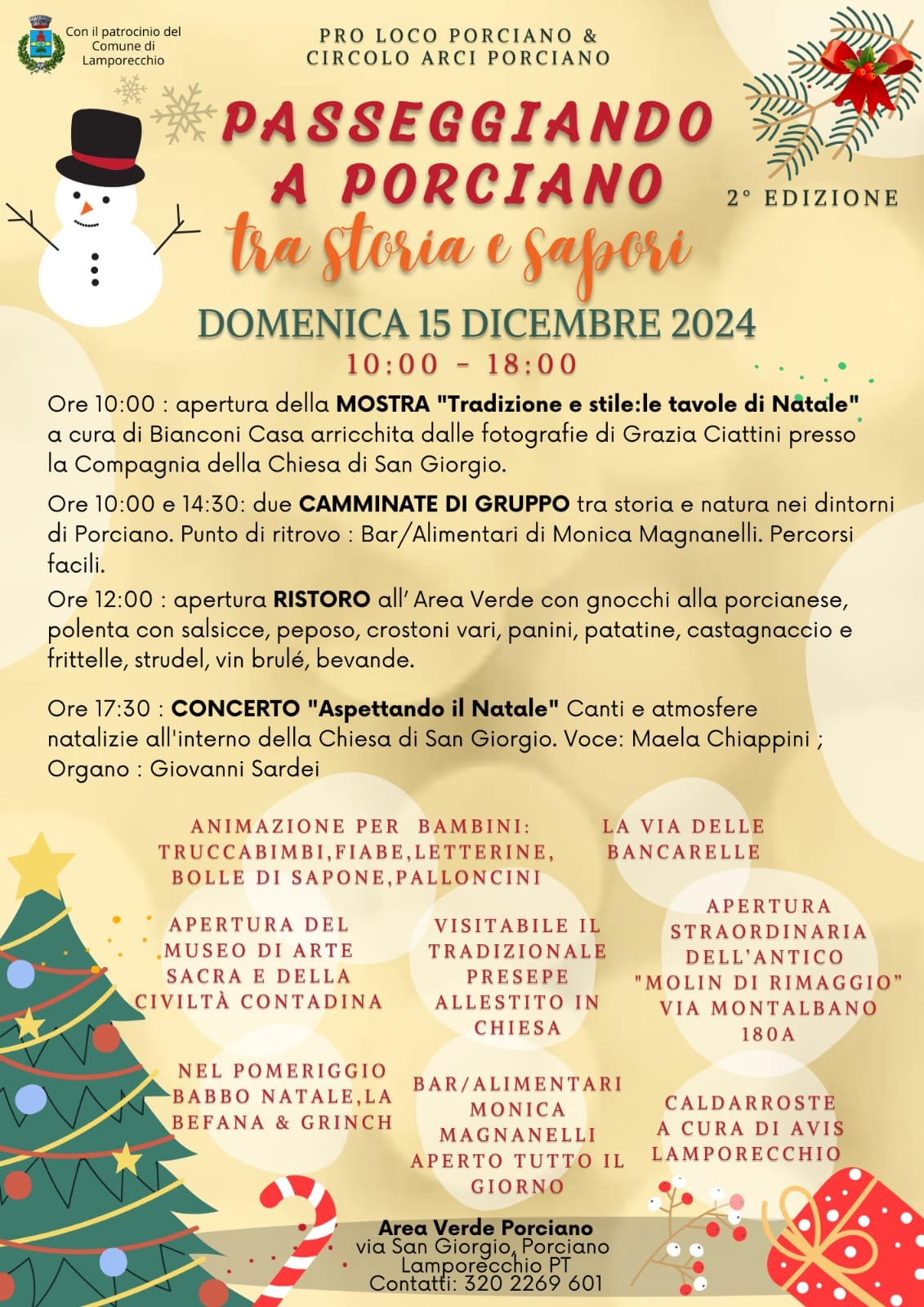 In occasione delle festività natalizie il 15 dicembre 2024 dalle ore 10.00 alle ore 18.00 nell'area a verde di Porciano si svolgerà la seconda edizione "Passeggiando a Porciano tra storia e sapori"