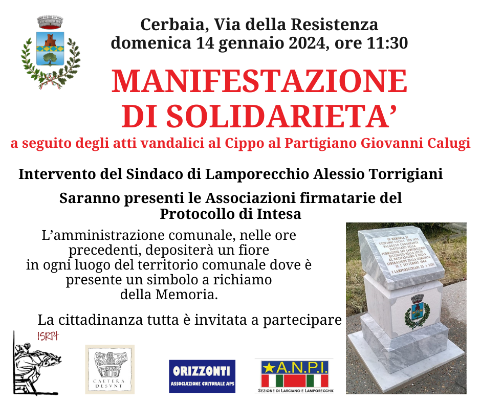 A seguito degli atti vandalici al Cippo in memoria del Partigiano Giovanni Calugi, l’amministrazione comunale invita tutta la cittadinanza alla manifestazione di solidarietà che si terrà domenica 14 gennaio, con ritrovo alle ore 11:30 presso il Cippo in via della Resistenza, frazione Cerbaia.