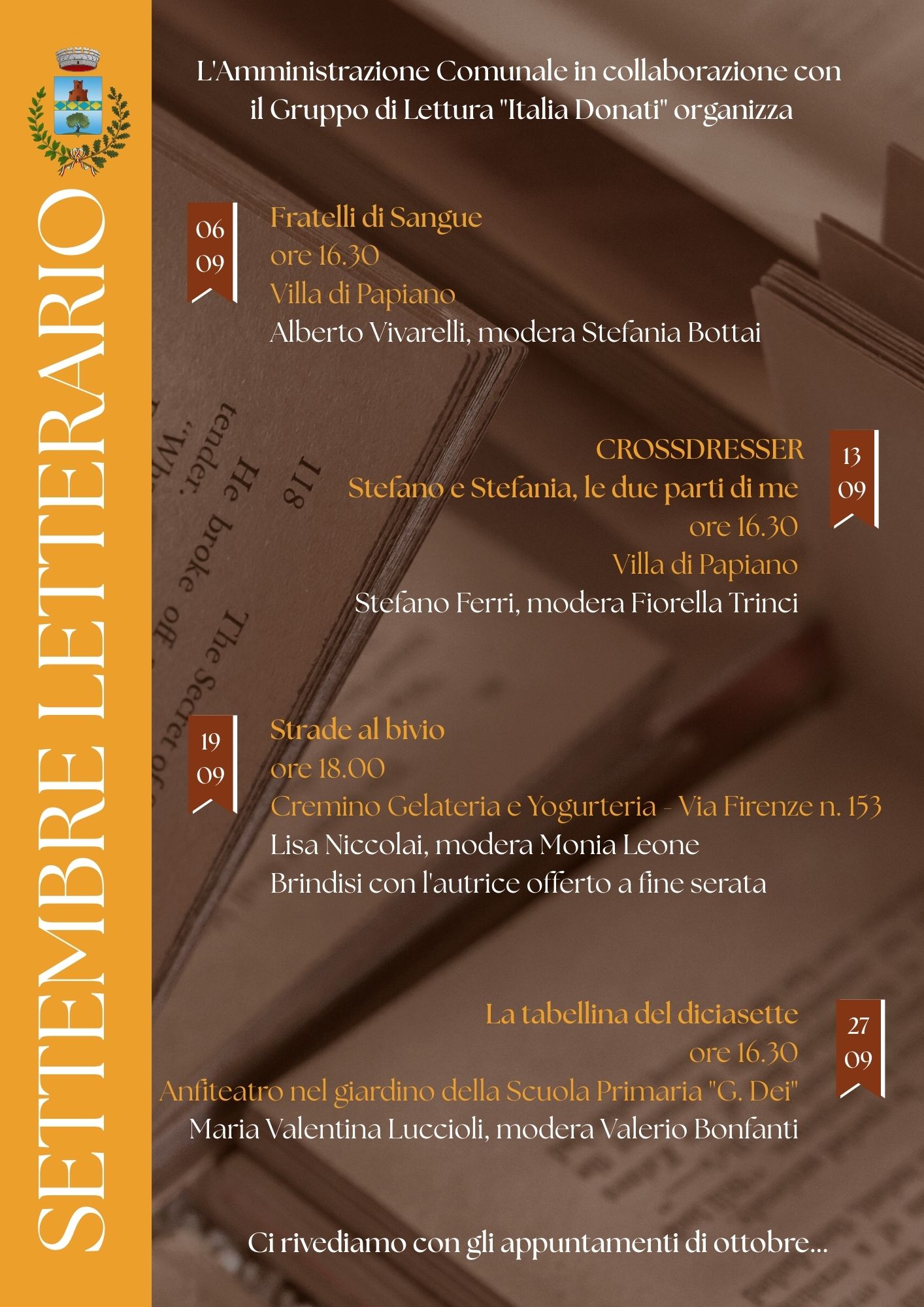 Il mese di settembre dedicato alla letteratura con una rassegna itinerante.