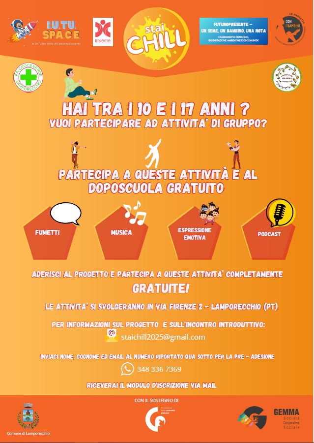 L'amministrazione è lieta di invitare i ragazzi e le ragazze tra i 10 e i 17 anni a partecipare al progetto "Stai Chill".