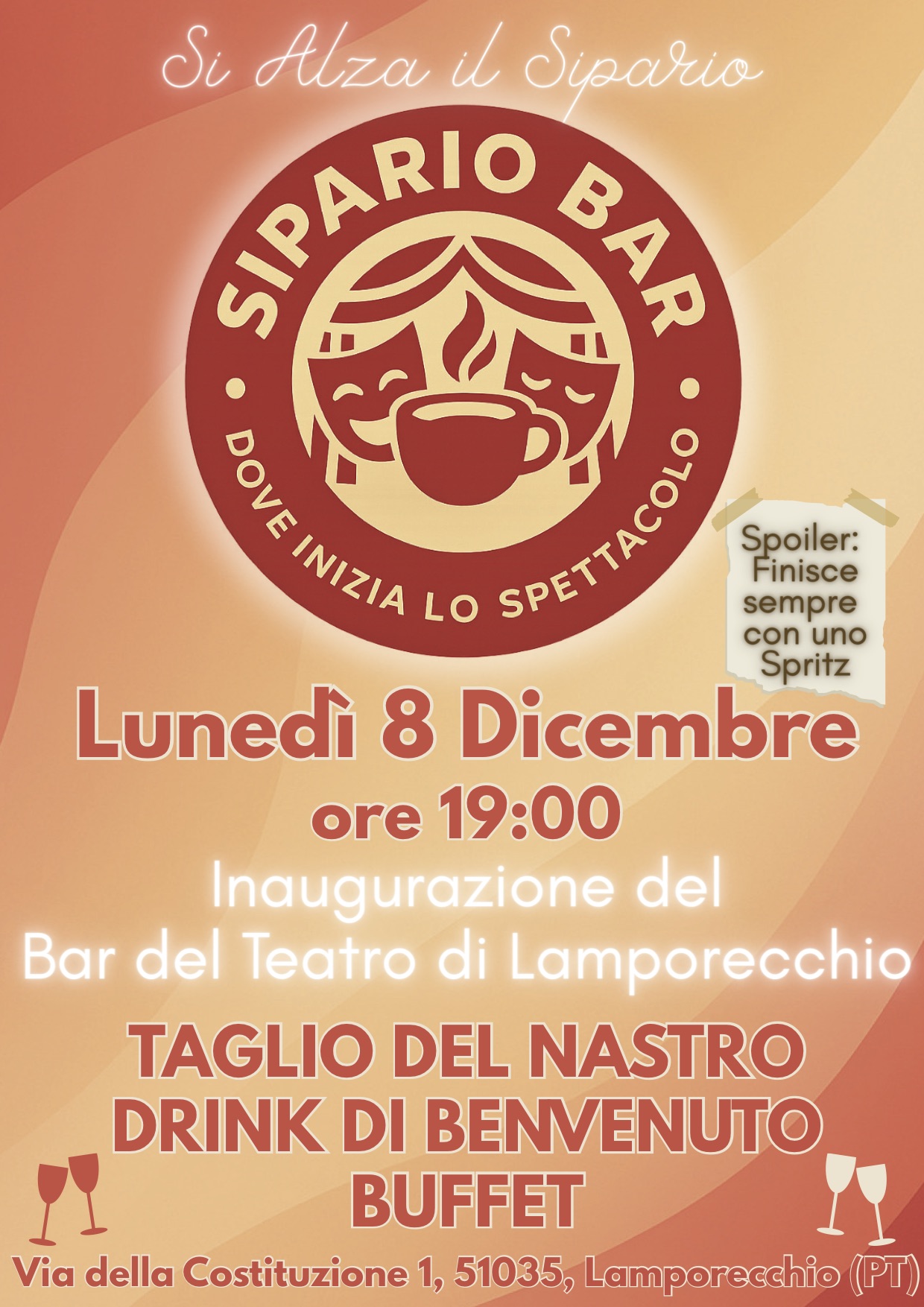Siete tutti invitati all'inagurazione del nuovo Bar del Teatro Comunale "SIPARIO BAR" con taglio del Nastro, drink di benvenuto e buffet.