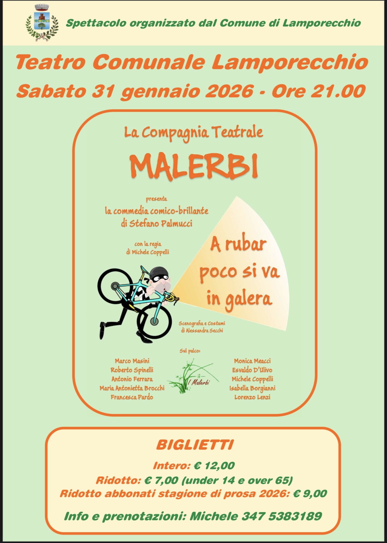 Sabato 31 gennaio 2026 alle ore 21:00 presso il Teatro Comunale di Lamporechio, la compagnia amatoriale i Malerbi presentano "A rubar poco si va in galera".
