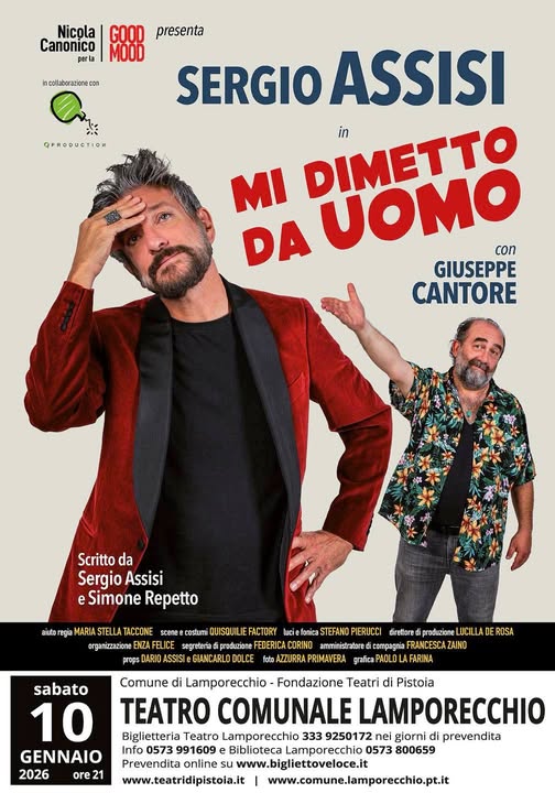 Sarà Sergio Assisi ad aprire ufficialmente la stagione di prosa 2026 del Teatro Comunale di Lamporecchio, con lo spettacolo “Mi dimetto da uomo”, in scena sabato 10 gennaio 2026 alle ore 21, insieme a Giuseppe Cantore.