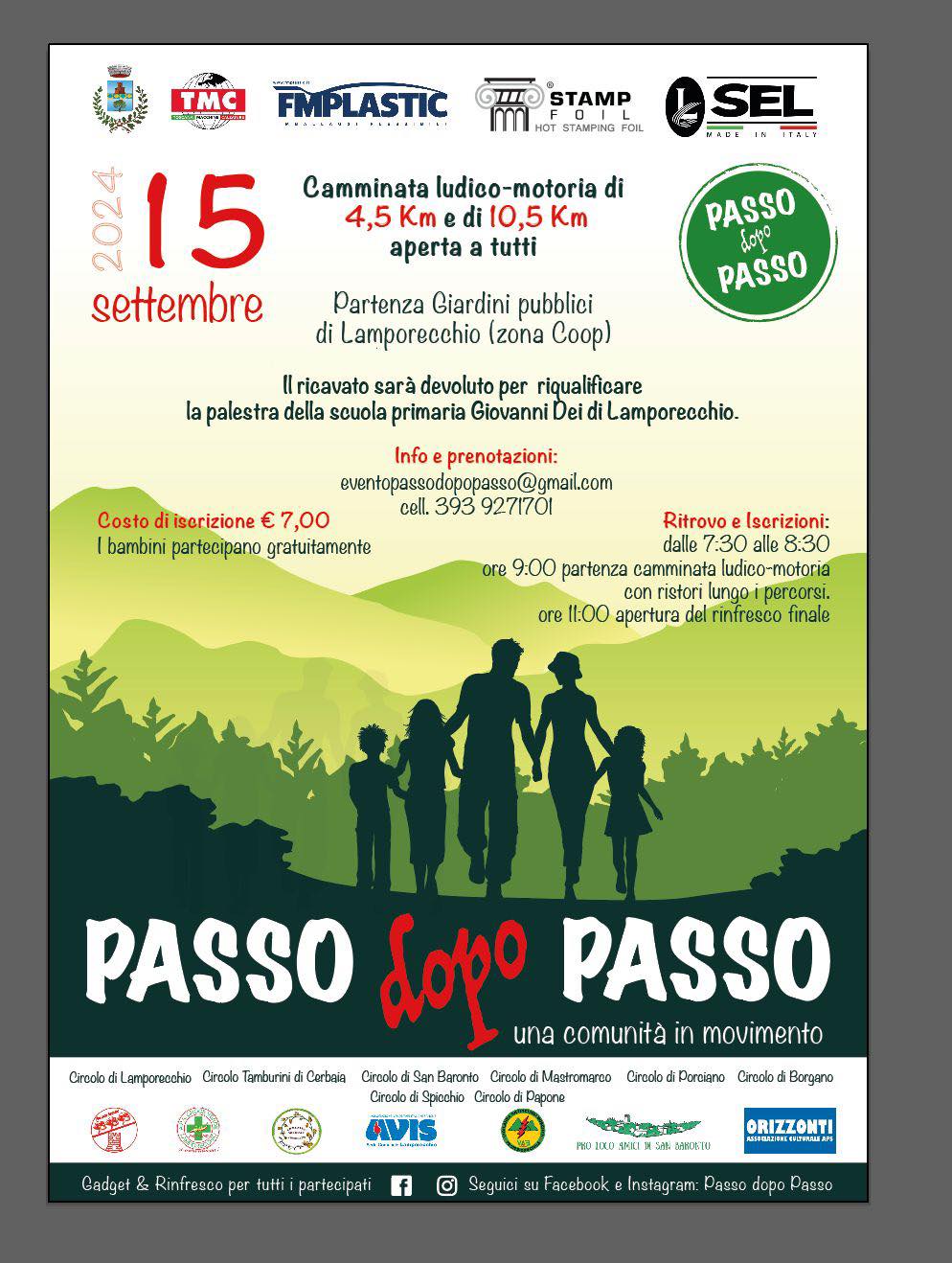 Domenica 15 settembre dalle ore 7:30 con partenza dai Giardini pubblici di Lamporecchio (zona scuole) si terrà la manifestazione "PASSO dopo PASSO" con la camminata ludico-motoria di 4,5 km e di 10,5 km aperta a tutti.