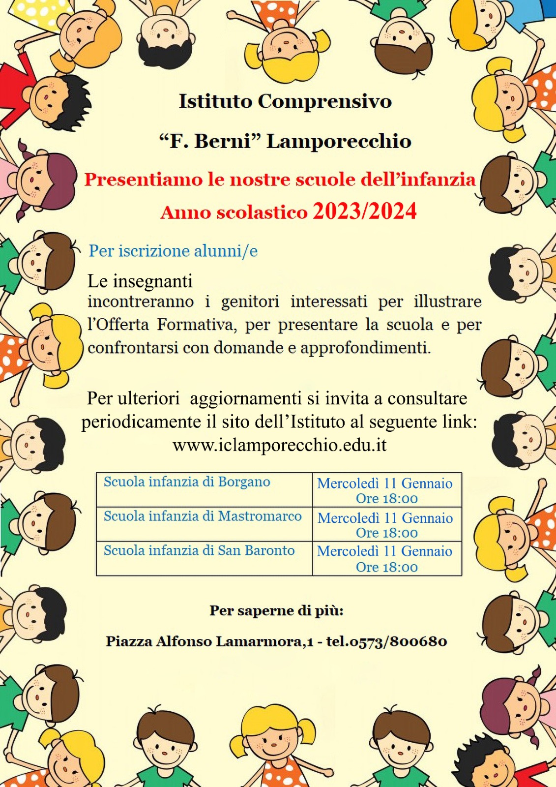 Le insegnanti dell'istituto comprensivo "F. Berni" di Lamporecchio, mercoledì 11 gennaio alle ore 18, incontreranno i genitori interessati per illustrare l'offerta formativa per presentare la scuola e per confrontarsi con domande e approfondimenti.