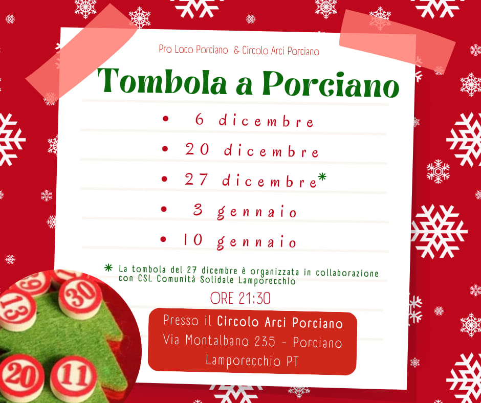 In occasione delle festività natalizie la Pro Loco di Porciano e il Circolo ARCI di Porciano organizzano delle serate di Tombola presso il locali del Circolo.