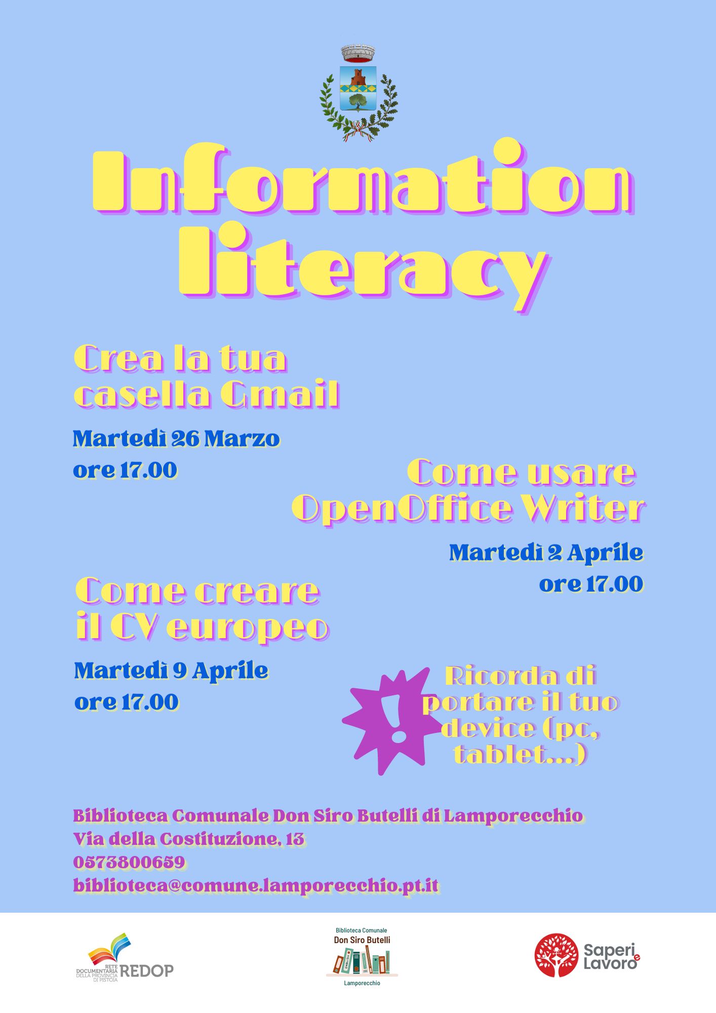 Le lezioni si svolgeranno presso la Biblioteca comunale "Don Siro Butelli" di Lamporecchio con prenotazione obbligatoria.