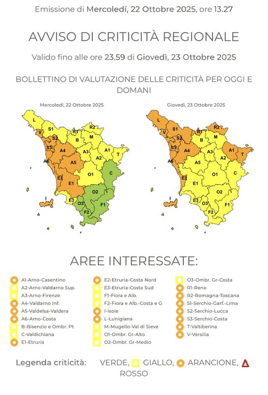 Prorogata allerta arancione dalla sala operativa per rischio idrogeologico per la giornata di domani, giovedì 23 ottobre 2025 ed emessa allerta gialla per vento.