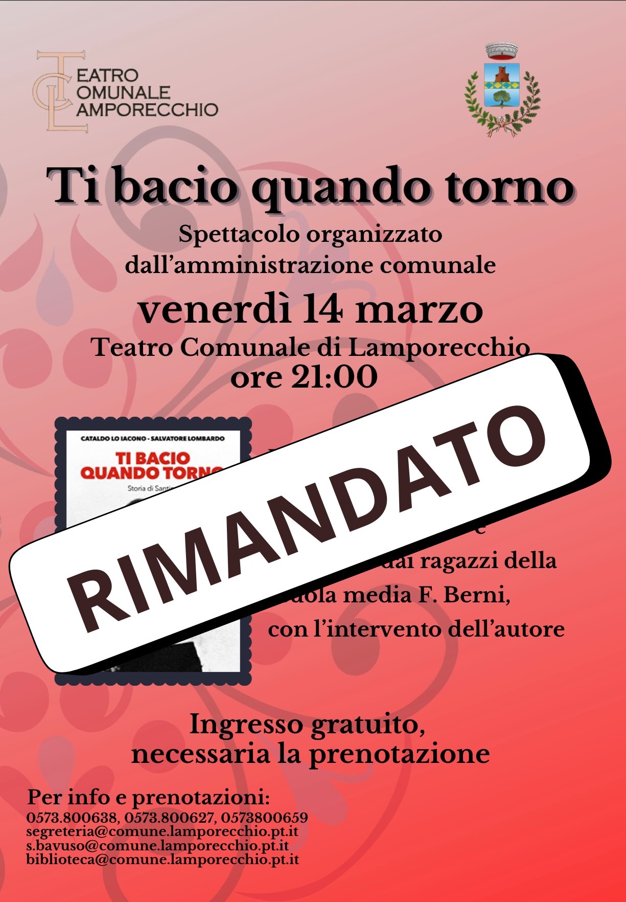 Si comunica che causa allerta meteo arancione lo spettacolo organizzato dall'Amministrazione, "Ti bacio quando torno", in programma per domani sera, venerdì 14 marzo è RIMANDATO.