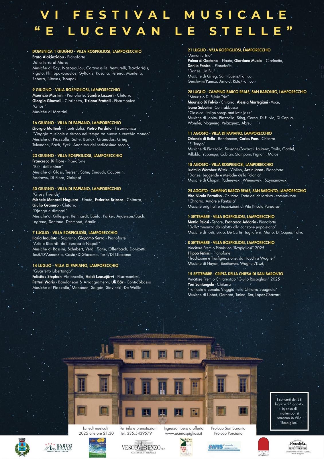 www.acmrospigliosi.itTorna l’appuntamento con il festival "E lucevan le stelle" organizzato dall’Associazione Cultura e Musica Rospigliosi sotto la direzione artistica del M° Luca Torrigiani.