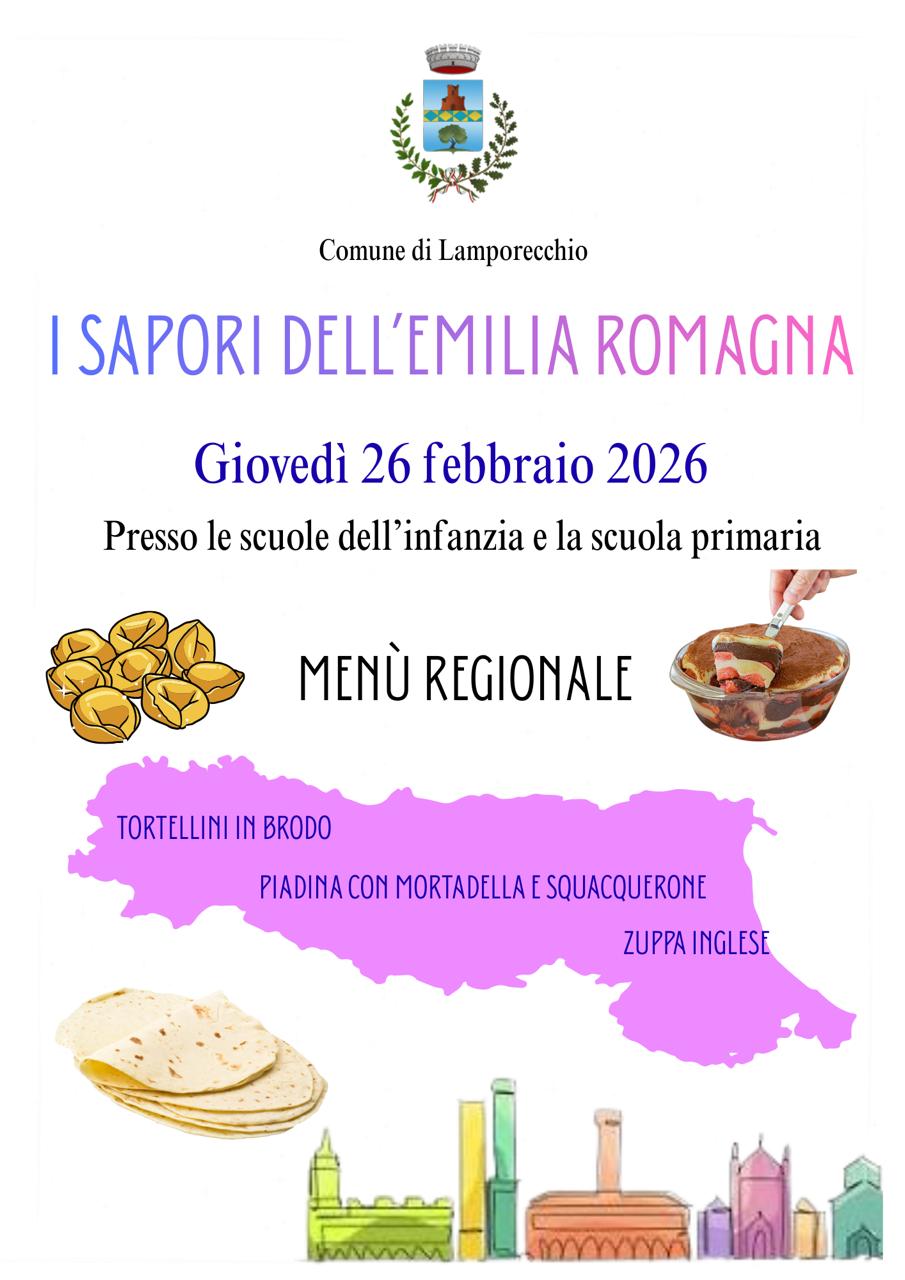Giovedì 26 febbraio, presso i refettori della Scuola Primaria e delle Scuole dell'Infanzia , verrà proposto un menù regionale, ispirato alla cucina dell'Emilia Romagna.