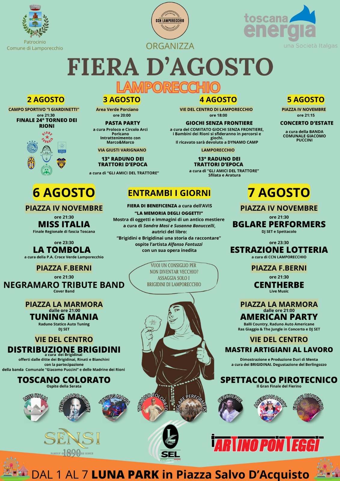 Dal 1° agosto inizia una settimana ricca di eventi e manifestazioni per grandi e piccini, che volgerà a termine con le due giornate di martedì 6 agosto 2024, con la tradizionale "Fiera d'Agosto - Sagra del Brigidino", e il giorno successivo con il "Fierino" ed i fuochi d'artificio.